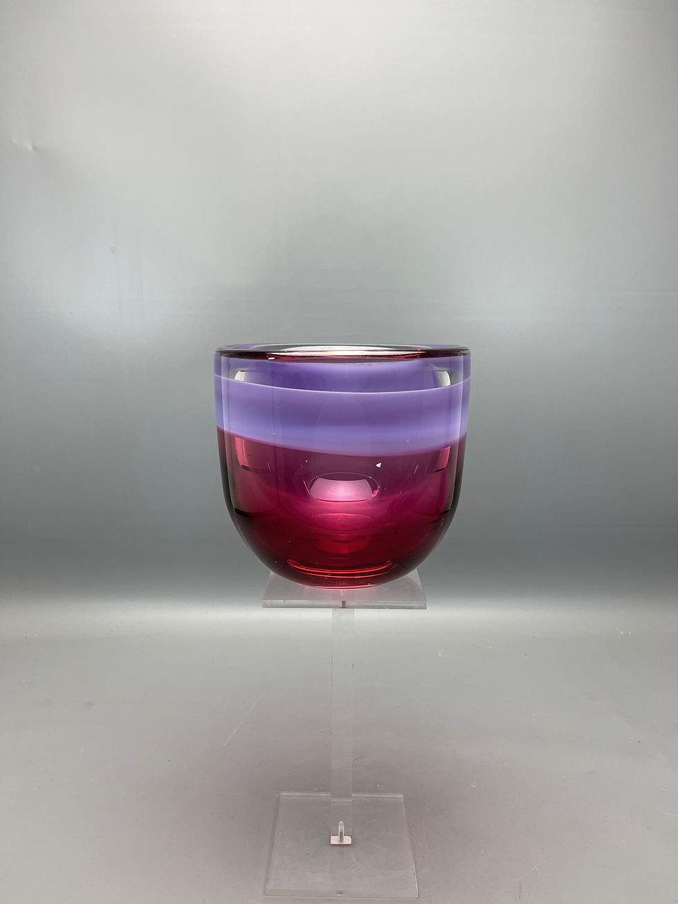 Krachtig ontwerp van A.D. Copier (ca. 1930) voor de Glasfabriek Leerdam en is een prominent onderdeel van de collectie optisch geblazen gebruiksglas. Het object is vervaardigd met een vakkundige optiek-techniek, waarbij het vloeibare glas in een mal is geblazen om de brede, verticale banen te vormen die het licht op warme wijze vangen en reflecteren. De vaas belichaamt de essentie van Copier's vroege werk: een eerlijke, functionele vorm gecombineerd met een rijke kleurdiepte en een strak lijnenspel dat naadloos past binnen het modernisme van de jaren 30.